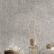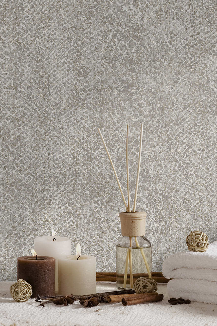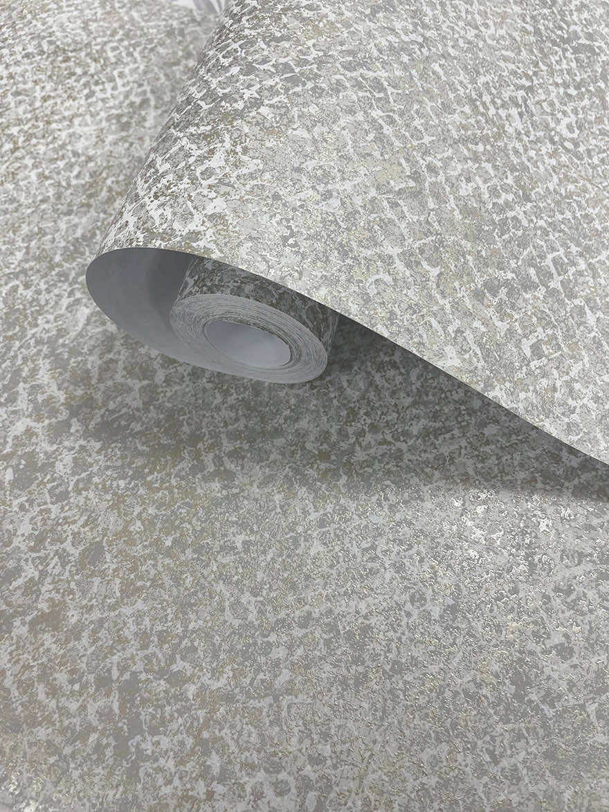 A snake-skin textured wallpaper with subtle metallic flicks and raised scales creates an exotic, luxurious look. The irregular, organic pattern adds tactile depth, while the slightly elevated scales catch light and shadow for a dynamic, three-dimensional effect.