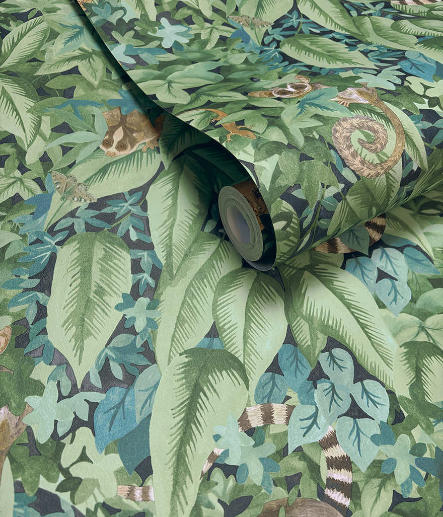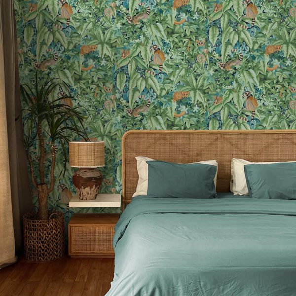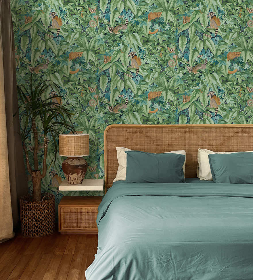 At first glance, a lush mosaic of leaves unfolds, look closer and the enchantment deepens. Among the foliage of rich layered leaves, Lemurs emerge, artfully and playfully concealed bringing personality and a touch of wild into the design. Comoros brings a calm, organic atmosphere to any space, blending natural beauty with a touch of playful discovery, ideal for creating a serene backdrop to any living space.