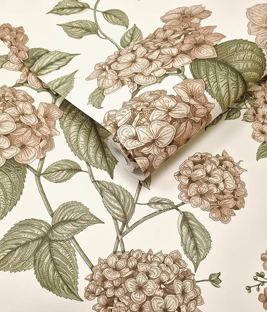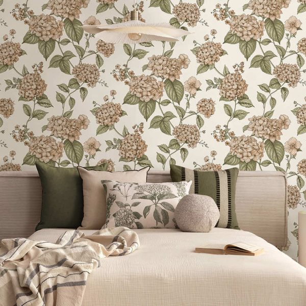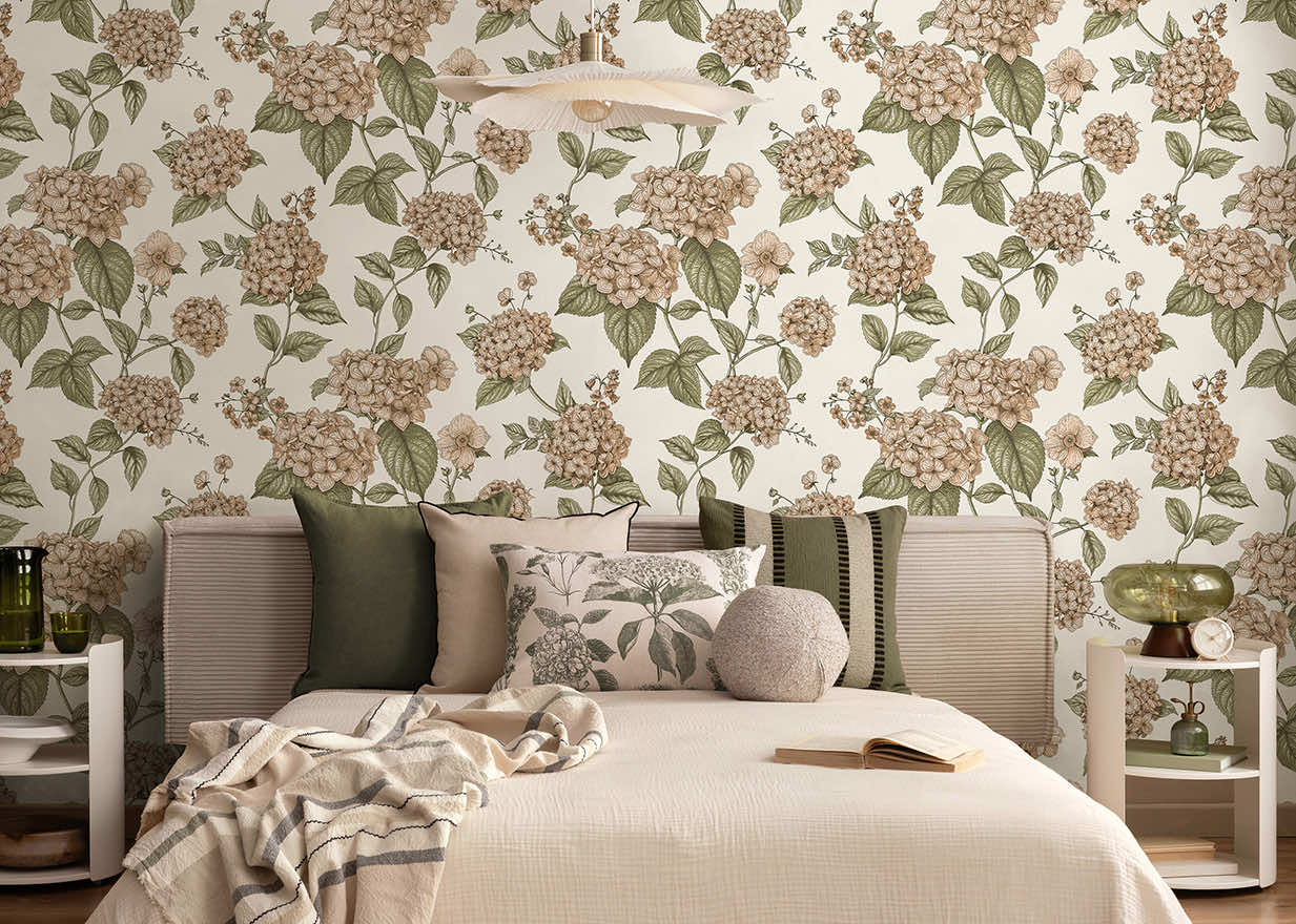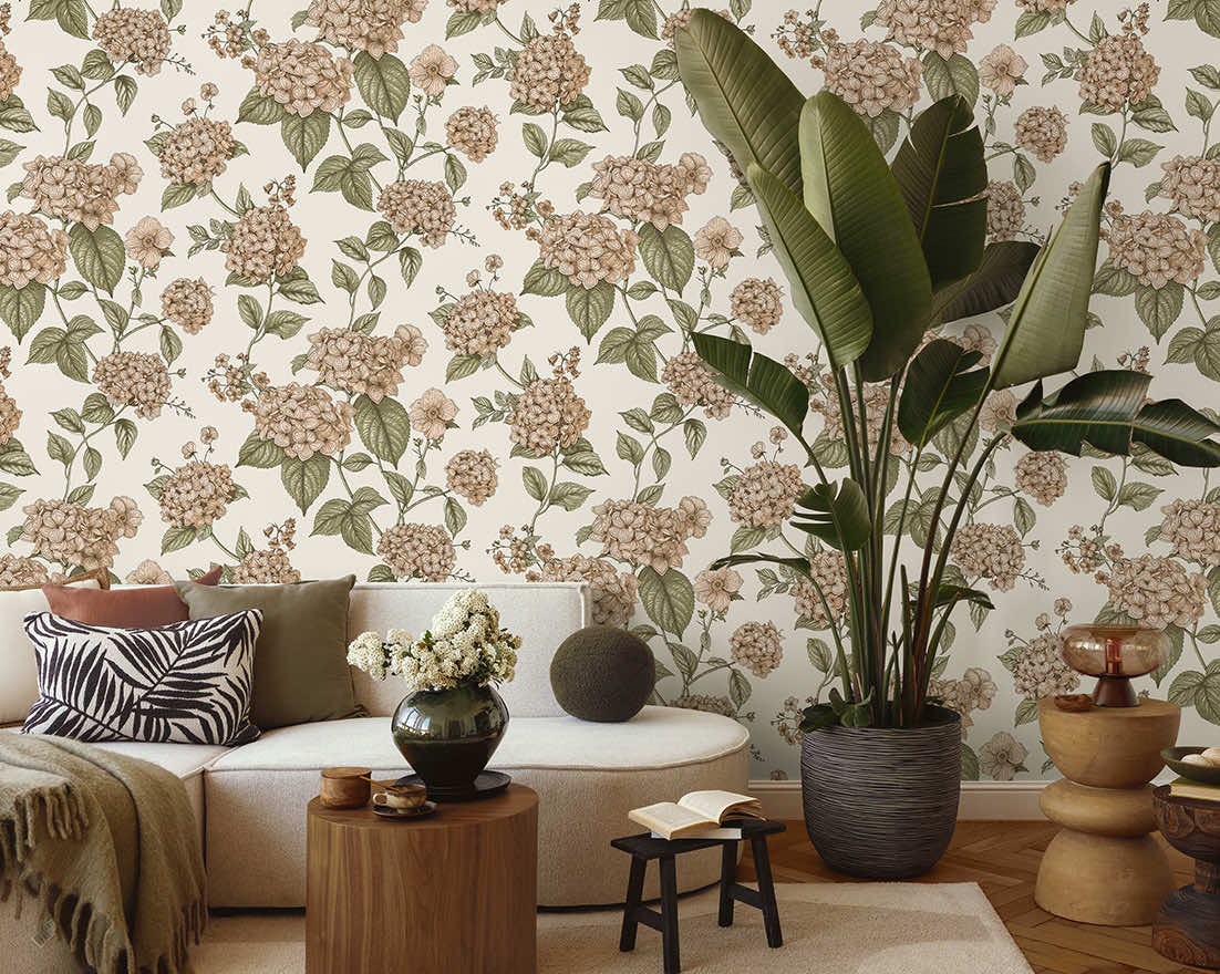 Ideal for interiors that seek a refreshing and sophisticated look, Hortensia transforms a room into a botanical statement with an artful display of elegant Hydrangea blossoms that appear to climb and grow up the wall. This design celebrates the beauty of simplicity, making every glance a moment of harmony and understated luxury.