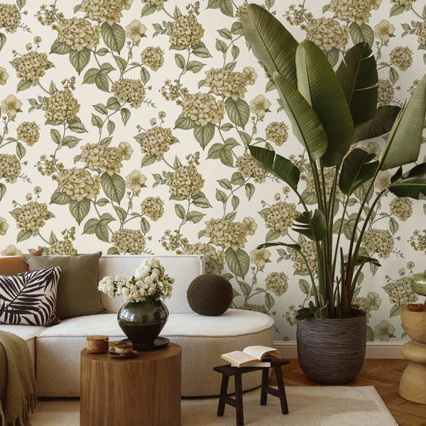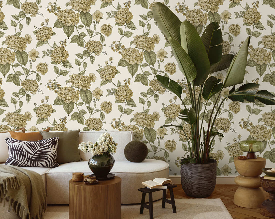 Ideal for interiors that seek a refreshing and sophisticated look, Hortensia transforms a room into a botanical statement with an artful display of elegant Hydrangea blossoms that appear to climb and grow up the wall. This design celebrates the beauty of simplicity, making every glance a moment of harmony and understated luxury.