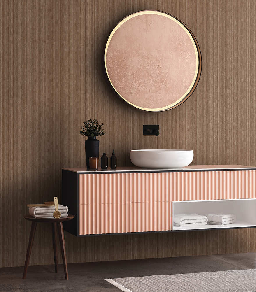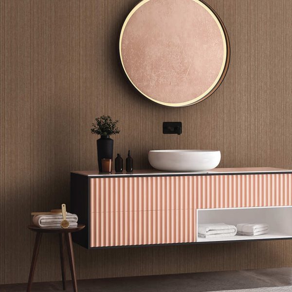 A refined striped design accented with delicate metallic lines and a raised acrylic chevron texture. The combination adds gentle movement, depth, and a modern shimmer—ideal for creating a sophisticated, understated feature wall.