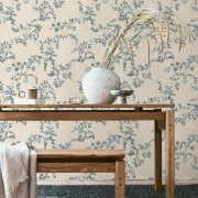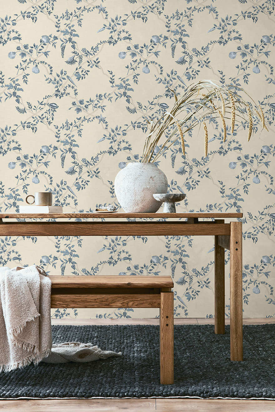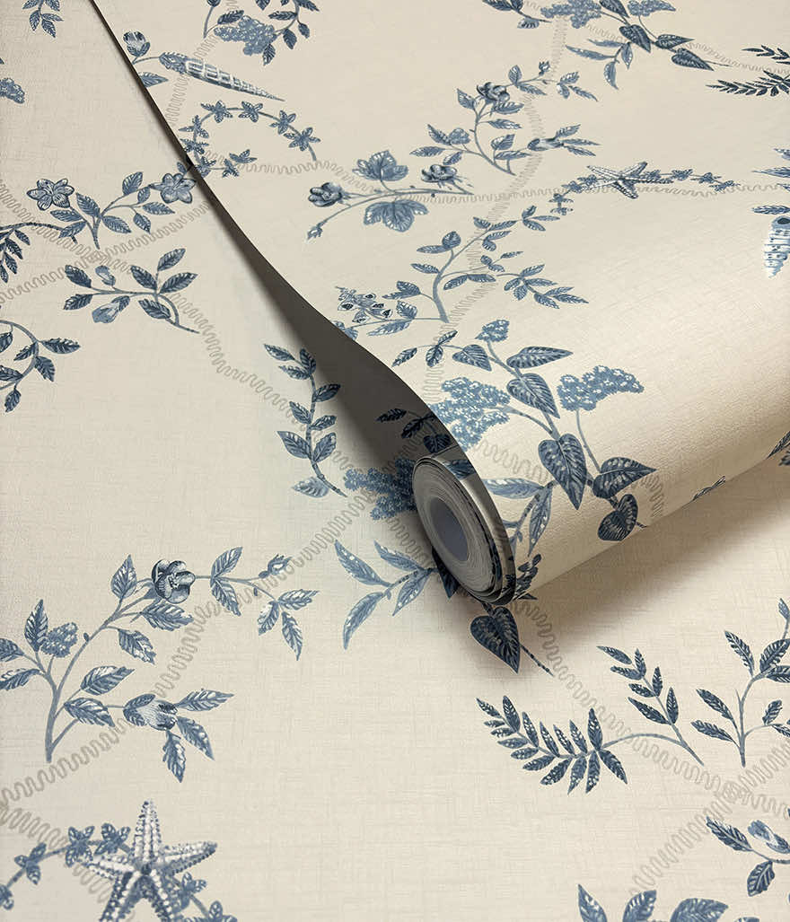 Capturing the serene elegance of coastal gardens where land and sea intertwine, Marina presents a graceful floral trellis with delicate vines winding upwards, adorned with soft blossoms that seem to move in the breeze. Woven through are subtle treasures, seashells nestled among the foliage, creating a sense of discovery after each glance. This wallpaper transforms any space into a haven of sunlit courtyards and natural beauty.