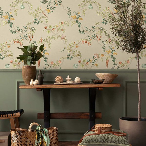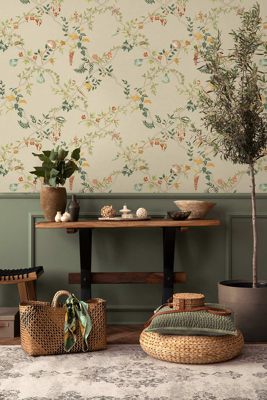 Capturing the serene elegance of coastal gardens where land and sea intertwine, Marina presents a graceful floral trellis with delicate vines winding upwards, adorned with soft blossoms that seem to move in the breeze. Woven through are subtle treasures, seashells nestled among the foliage, creating a sense of discovery after each glance. This wallpaper transforms any space into a haven of sunlit courtyards and natural beauty.