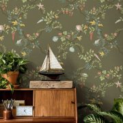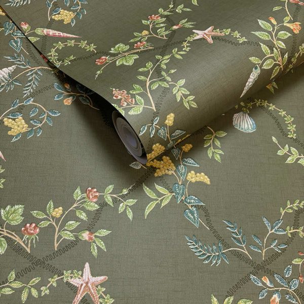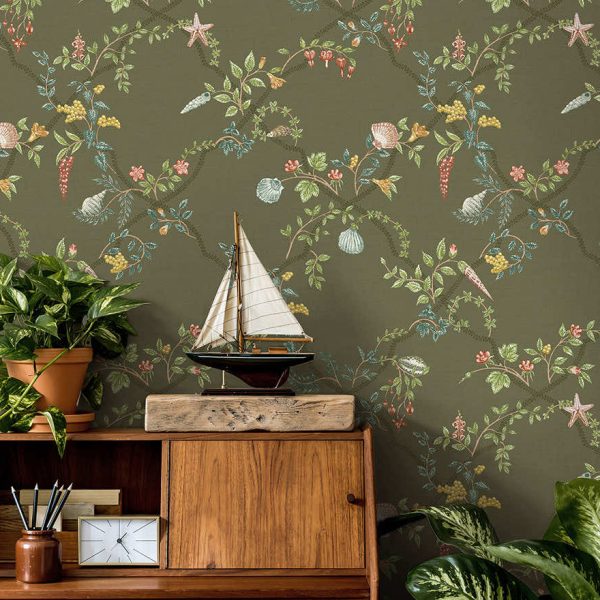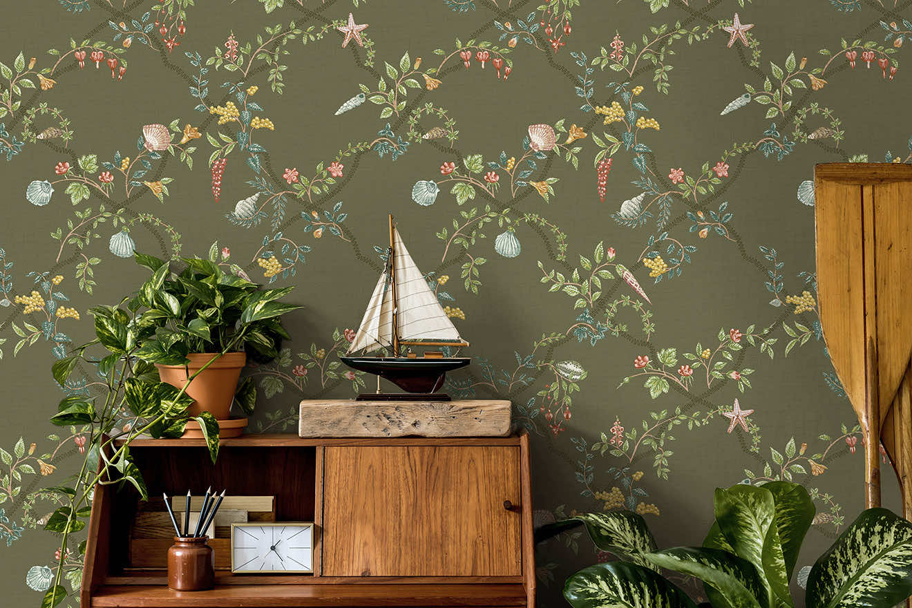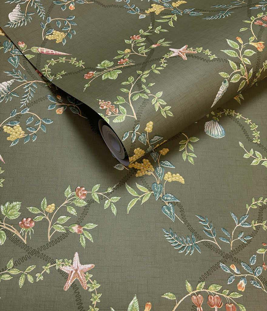 Capturing the serene elegance of coastal gardens where land and sea intertwine, Marina presents a graceful floral trellis with delicate vines winding upwards, adorned with soft blossoms that seem to move in the breeze. Woven through are subtle treasures, seashells nestled among the foliage, creating a sense of discovery after each glance. This wallpaper transforms any space into a haven of sunlit courtyards and natural beauty.